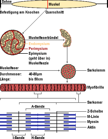 Das Streifenmuster, was Muskeln unter dem Mikroskop zeigen, entsteht durch die Anordnung dieser Myofilamente, die sich bei Muskelkontraktion ineinander schieben. Die Fasern und Faserbündel sind jeweils durch bindegewebige Hüllen und Septen voneinander getrennt. Der ganze Muskel ist von einer Muskelfaszie umhüllt.