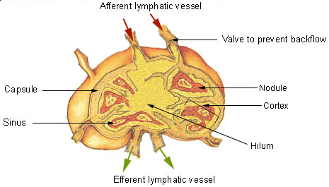 A lymph node is an organized collection of lymphoid tissue, through which the lymph passes on its way to returning to the blood. Lymph nodes are located at intervals along the lymphatic system. Several afferent lymph vessels bring in lymph, which percolates through the substance of the lymph node, and is drained out by an efferent lymph vessel.