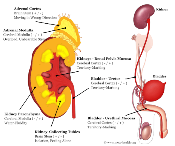 Renal Pelvis Mucosa – Urothelium (Cerebral Cortex, -/+) stress phase (boundary-marking): dilation, inconspicious tissue reduction enhanced excretion; Regeneration phase: painful pyelonephritis, hematuria