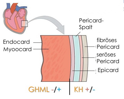 Peri- & Epicard(KH +/-) in Regenerationsphase A (schnelle Minderung des Herz-Füllvolumens bei Ödematisierung, Pericarderguss) oder nach Rezidiven durch Vernarbung und abnehmender Flexibilität (zunehmende Minderung des Herz-Füllvolumens), “Panzerherz”.