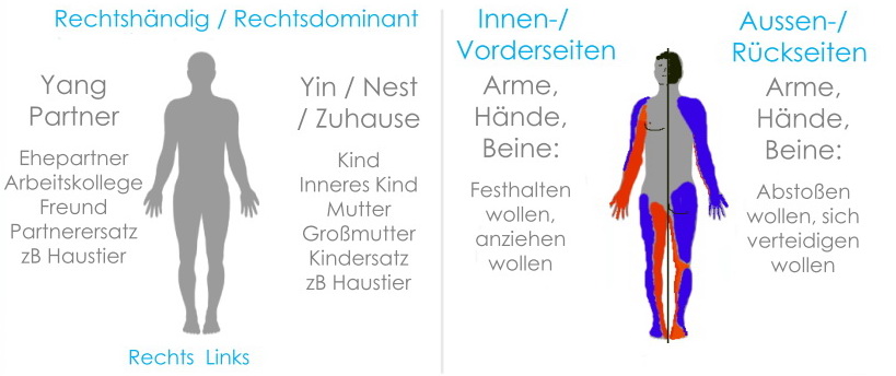 Hautsymptome beziehen sich auf den Ort ihres Auftretens. Der Konflikt kann direkt an diesem Ort erlebt sein (wie ein Angriff oder ein Kontaktverlust an der Stelle), oder eine symbolische Verbindung gemäß der Grafik haben: Seitendominanz ist relevant.