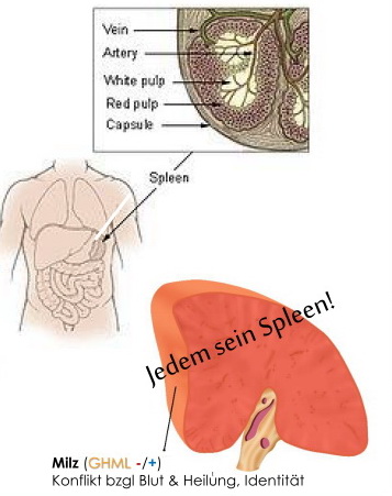 Die Milz (Splen) befindet sich im linken oberen Quadranten des Bauchraums. Ihre Struktur ähnelt der eines großen Lymphknotens, und sie fungiert dementsprechend als blutfilterndes Organ im Kreislaufsystem, ausserdem hat sie große Bedeutung für die roten Blutkörperchen und das Immunsystem. Die Milz ist Teil des mononuklear-phagocytierenden Systems: sie entfernt alte Erythrozyten und recykelt Eisen aus deren Hämoglobin, wodurch sie das Knochenmark unterstützt. Sie speichert und recykelt auch Thrombocyten für die Blutgerinnung.