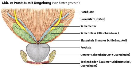 Die Prostata ist ein kastaniengroßes männliches Geschlechtsorgan, das einen Teil des Spermasekrets produziert. Sie befindet sich unterhalb der Harnblase vor dem Mastdarm, eingebettet in die Beckenbodenmuskulatur, und ist rektal tastbar. Sie ist fest verbunden mit dem Schambein (os pubis).